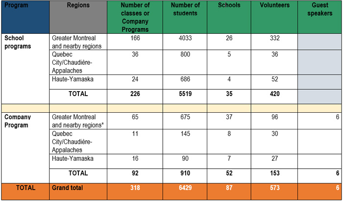 Our combined efforts allowed us to deliver over 320 school-day and extracurricular programs to more than 6,500 Quebec students—a 7% increase compared to last year. Thank you for believing in the importance of our mission. Your involvement means that young people are getting the real-world experience and skills they need to succeed in their professional life. Today, more than ever, we need to work together to encourage kids to stay in school and help them succeed as professionals and entrepreneurs in Quebec. Your time, talent, sage advice and financial support make a world of difference.